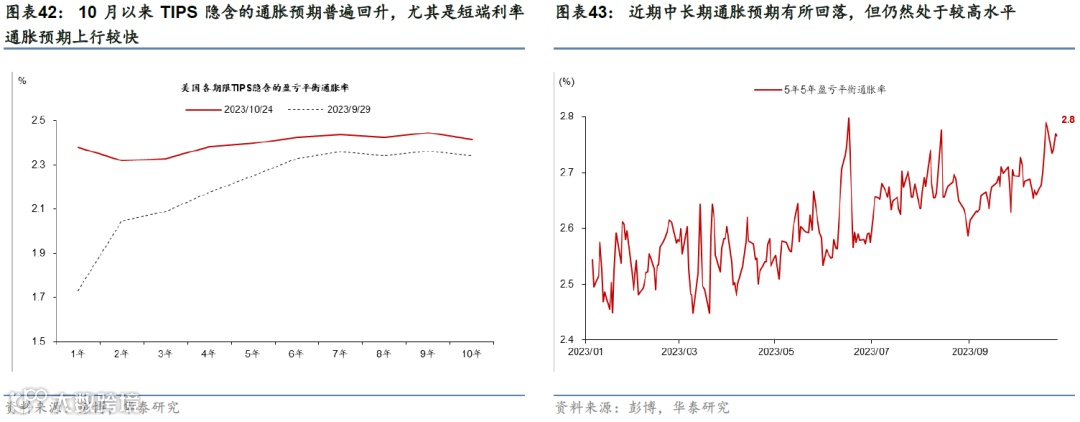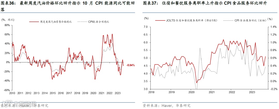 短期通胀预期有所回升,但核心通胀可能回落。9月美国表观CPI环比超预期,环比达到0.4%。虽然10月汽油零售价格指示能源分项环比未来或小幅回落,但不排除巴以冲突加剧通过油价推高表观通胀的可能性(参见《简析巴以冲突的潜在宏观影响》,2023/10/19)。但核心通胀可能下行,高频指标指示租金和在外住宿分项或回落。此外,巴以冲突下油价回升以及美国经济韧性推升短期通胀预期,TIPS 1年和2年通胀预期上行64bp和27bp。