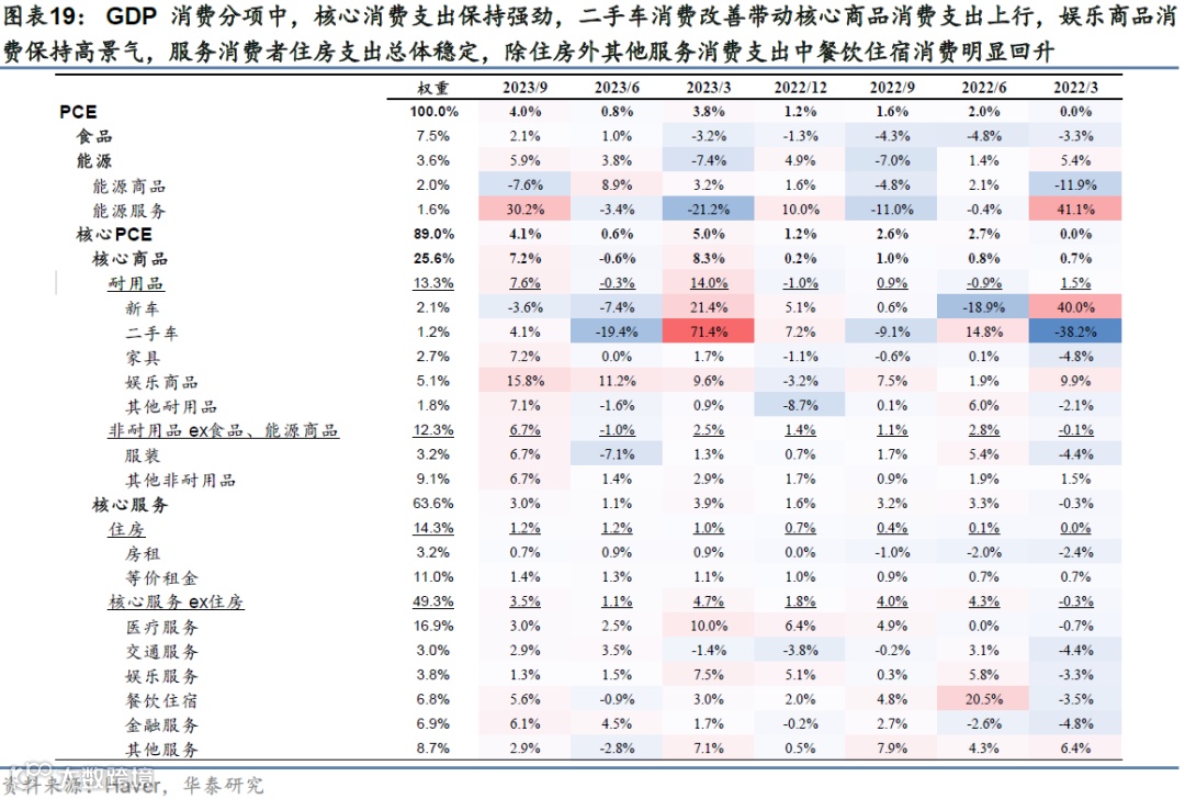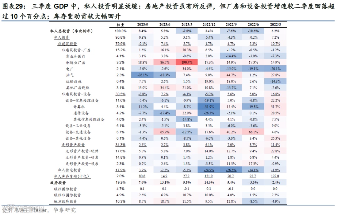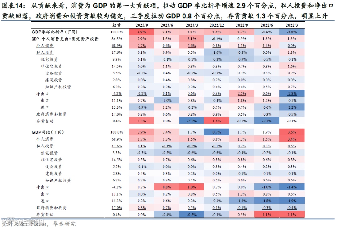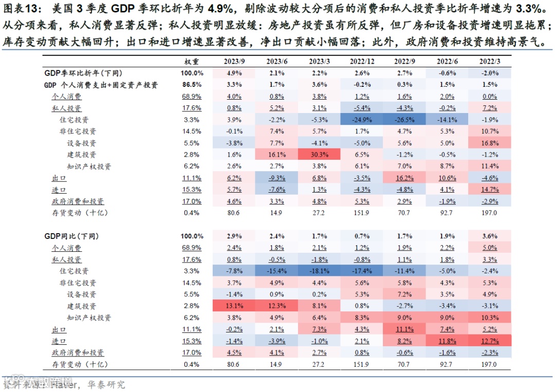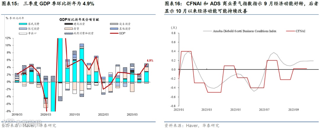 美国三季度GDP超预期,消费是主要支撑,投资表现疲软。美国3季度GDP季环比折年为4.9%,高于彭博一致预期的4.5%,剔除波动较大分项后的消费和私人投资季比折年增速为3.3%。从分项来看,私人消费显著反弹,季比折年增速达到4.0%;私人投资明显放缓:房地产投资虽有所反弹,但厂房和设备投资增速较二季度回落超过10个百分点;库存变动贡献大幅回升;出口和进口增速显著改善,净出口贡献小幅回落;此外,政府消费和投资维持高景气,季比折年增速为4.6%,连续五个季度正增长。CBO公布的测算显示,2023财年美国财政赤字(剔除学生贷款豁免影响)或达到2万亿美元,占GDP之比达到7.5%。