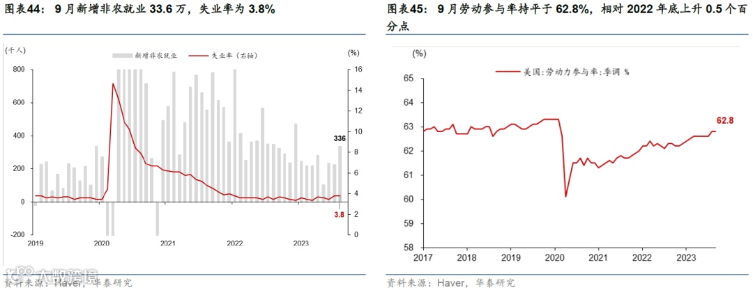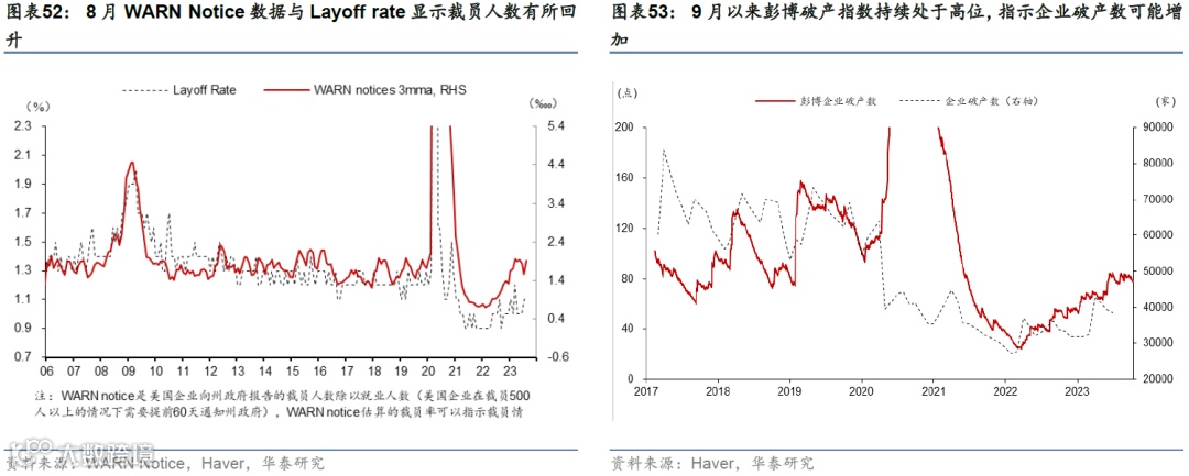 9月新增非农就业回升,但持续性存疑。9月美国新增非农就业33.6万,高于8月的22.7万人;劳动参与率持平于62.8%。8月岗位空缺回升超预期,但高频数据指示回升或不可持续。裁员率上升、咨商会就业机会充足率指标以及NFIB招聘难度指标均显示美国就业市场仍然在持续降温。