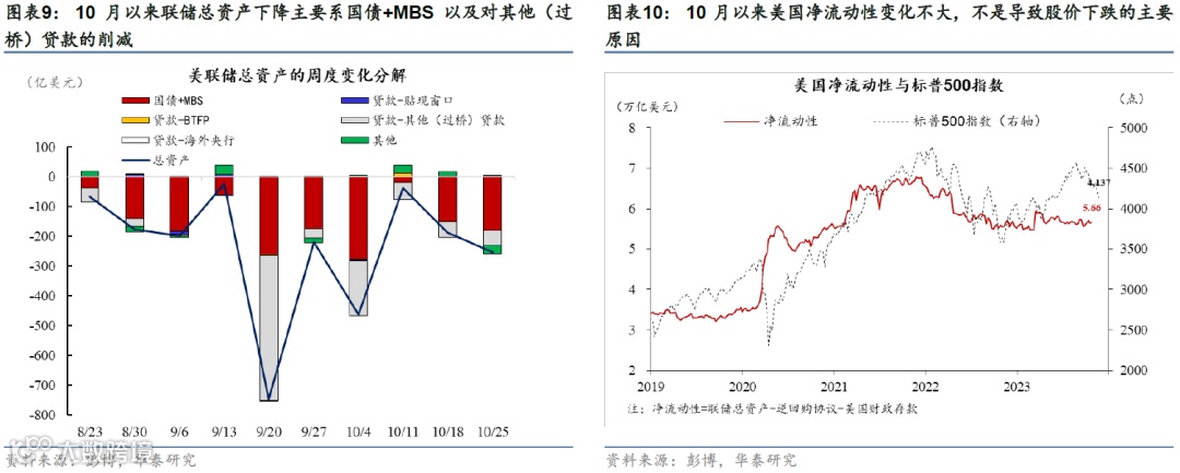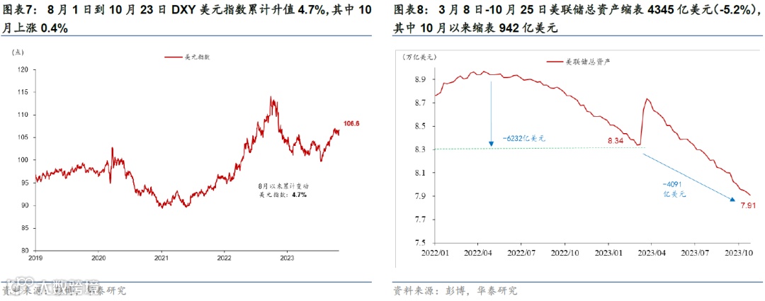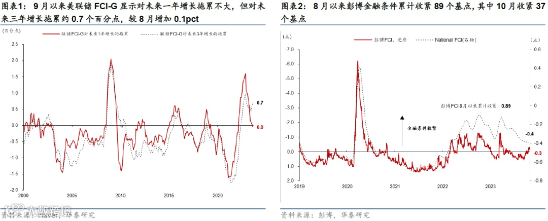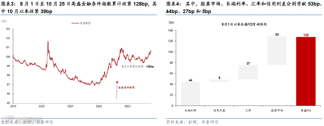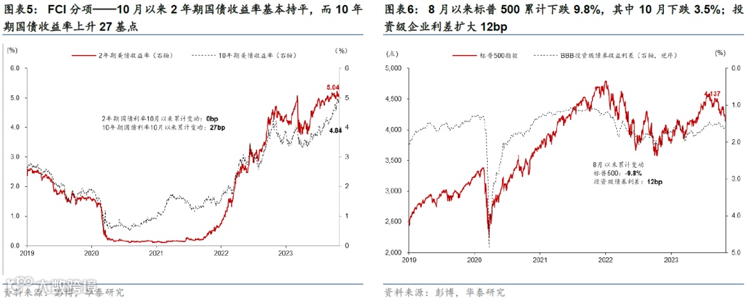 8月以来股市下跌、美债长端利率上行、美元走强以及信用利差走阔导致金融条件明显收紧。联储鹰派表态、美国经济韧性以及对美国政府债务可持续的担忧显著推升美债利率,10年期美国国债利率一度突破5%,10月26日收于4.84%;利率上升以及部分公司盈利不及预期导致美股明显回调,截至10月26日,标普500、纳斯达克指数相对7月高点累计下跌9.8%、12.3%。8月1日至10月25日,美国高盛金融条件指数(FCI)累计收紧128bp,同期,彭博金融条件也收紧89基点。