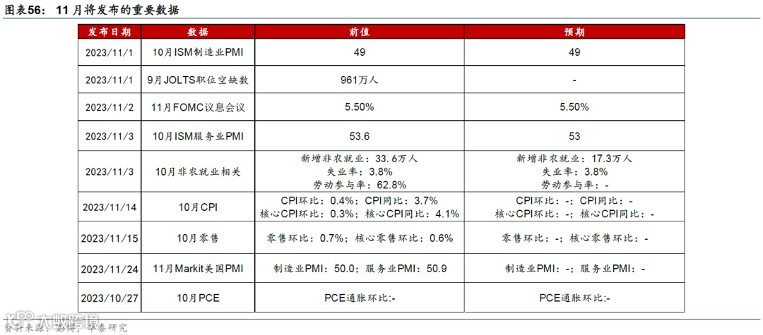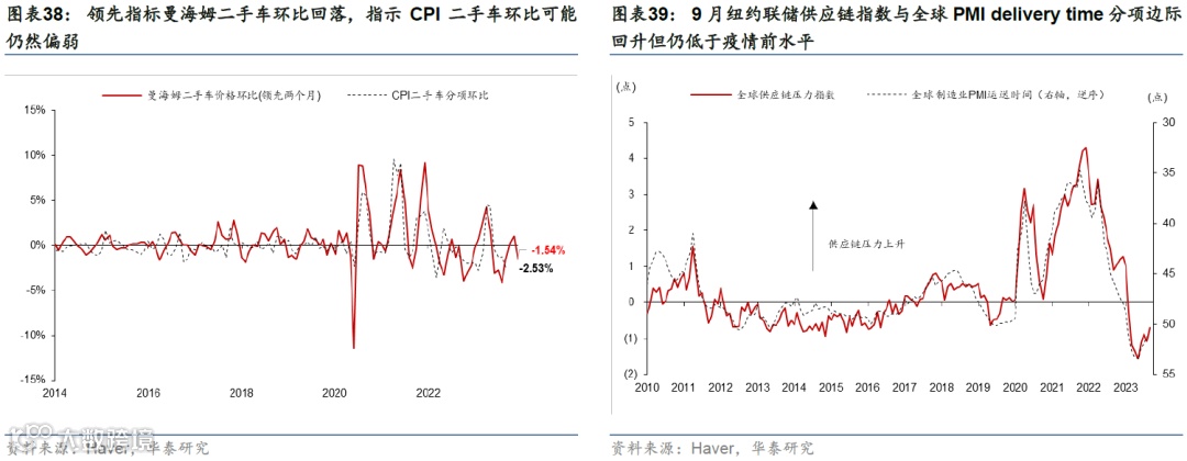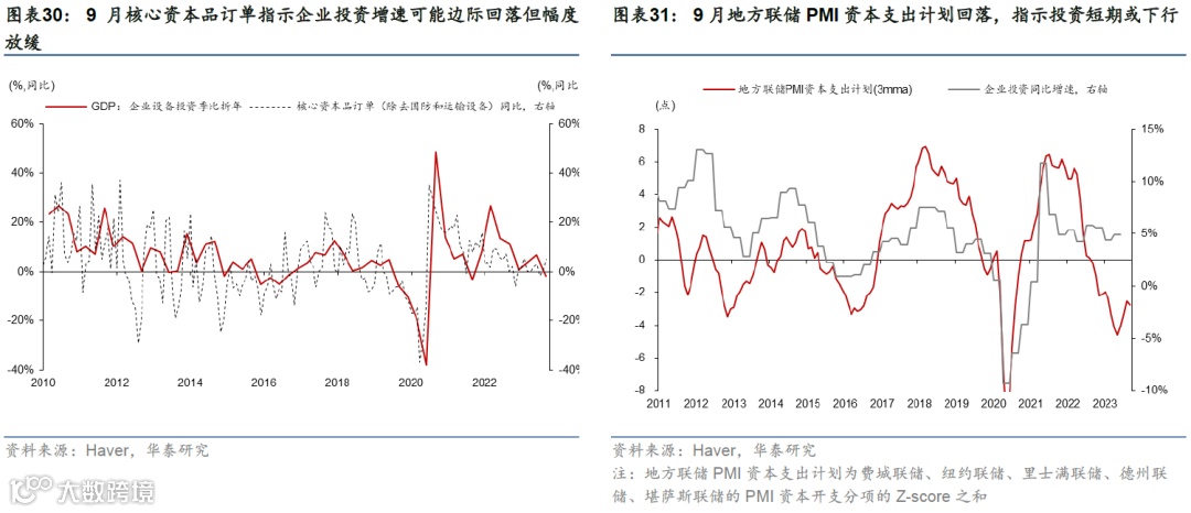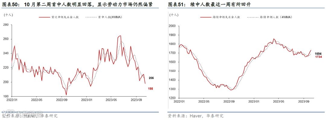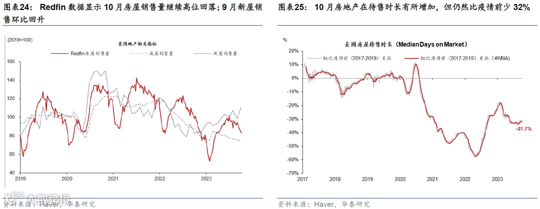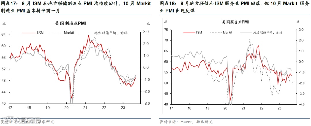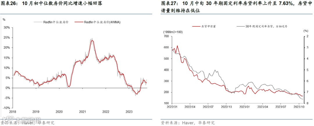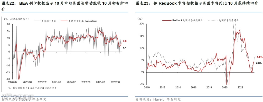 高频数据显示消费动能有所放缓,地产和投资承压。10月中旬美国刷卡消费超过基准6.6%,但低于三季度9.0%的均值。地产方面,30年期固定房贷利率升至7.6%的高位,而Redfin数据显示,10月房屋销售量和房价进一步回落。投资方面,9月核心资本品订单指示企业投资增速可能边际回落但幅度放缓;9月地方联储PMI资本支出计划指示投资短期或小幅下行。(参见《美国四季度增长或将明显减速》,2023/10/27)
