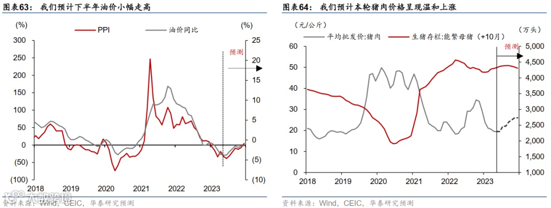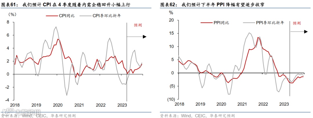 在内需趋弱、外需仍有较大不确定性的情形下,预计价格指标全年将维持低位。我们下调2023年的CPI预测至0.9%。同时下调2023年PPI预测至-2.3%(图表60)。从节奏上看,今年2至3季度CPI或将较1季度的1.3%继续回落至0.5%左右,而在4季度随着内需企稳回升小幅上行至1.2%,并在2024年温和上行至1.7%(图表61)。而PPI年内或难转正,但2季度或成为年内低点(录得-3.7%),下半年降幅有望逐步收窄,并有望于2024年2季度转正(图表62)。具体看: