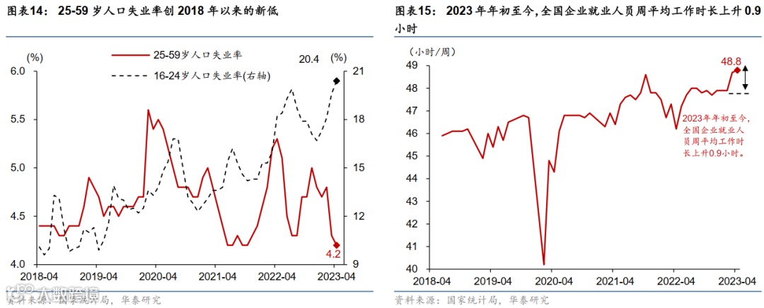 与其他国家疫情后复苏的经验相比,中国经济复苏后劳动参与率和产能回升较快,但收入和需求回升总体偏慢。纵观全球,虽然防疫政策优化后中国内需随之快速反弹,但比较其他国家重启的经验,中国也呈现不同的特点。一方面,国内工业生产、就业、和供应链效率的回升显然比其他国家更为迅速、高效。但另一方面,内需恢复动力不足,居民储蓄意向持续偏高,收入和消费回升持续性不足,由此,对其他经济部门的正向溢出效应也有待加强。收入方面,低基数下2023年1季度名义可支配收入同比增长5.1%,与名义GDP基本持平。然而,用2022-23两年复合增速衡量,1季度居民可支配收入增长仅为5.7%,不及名义GDP两年复合6.9%的增长率,显示劳动者薪酬占GDP的比例呈下降趋势,这与其他国家走势有所不同。图表14显示,目前25岁-59岁劳动力失业率已经位于2018年以来历史低点,而25岁以下失业率达到历史高点,就业数据显示劳动力市场明显分化,但劳动参与率仍然居高不下,和其他国家疫情后的表现有所不同。同时,图表15显示,今年以来中国居民的周度工作时长上升了2%左右,而其他国家和疫前水平总体持平,显示居民就业动力较强,但企业扩张动力不足,可能反映企业对长期发展、投资、扩张的信心有待进一步巩固。