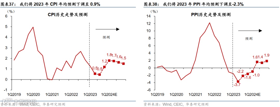 另一方面,我们预计2023/2024年全年PPI同比增速可能达到-2.3%/1%:分季度看,我们预计PPI同比增速可能在2023年2季度触底、下半年降幅逐步收窄,2024年2季度或回正,全年温和回升至1%。