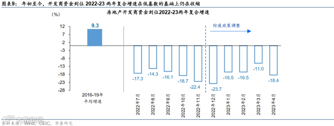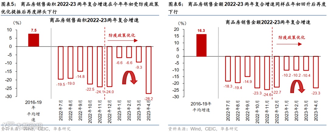 复盘2023年1-5 月总需求走势,我们观察到内需回升在1-2月“开门红”后动能有所走弱,并在4月呈明显下滑趋势。5月高频指标显示,2022-23两年复合增长率5月或继续低于4月。内需相关指标中,3月下旬后地产及相关需求势能下行速度及影响尤为值得关注。由此,开发商现金流修复中断,地产及相关产业链融资环境再度恶化、导致信贷周期承压。