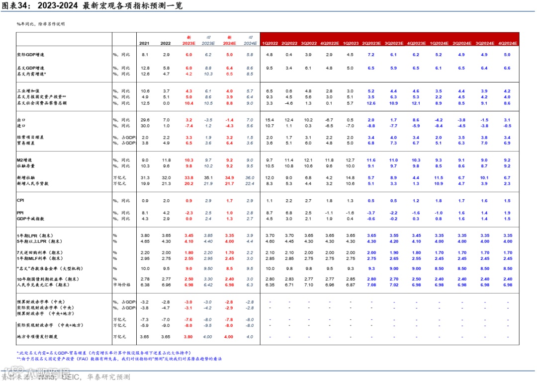 结合以上对近期趋势的分析及政策路径假设,我们更新2023-24年增长路径各项主要指标如下(具体各项宏观指标预测及新旧预测对比,请参见图表34):