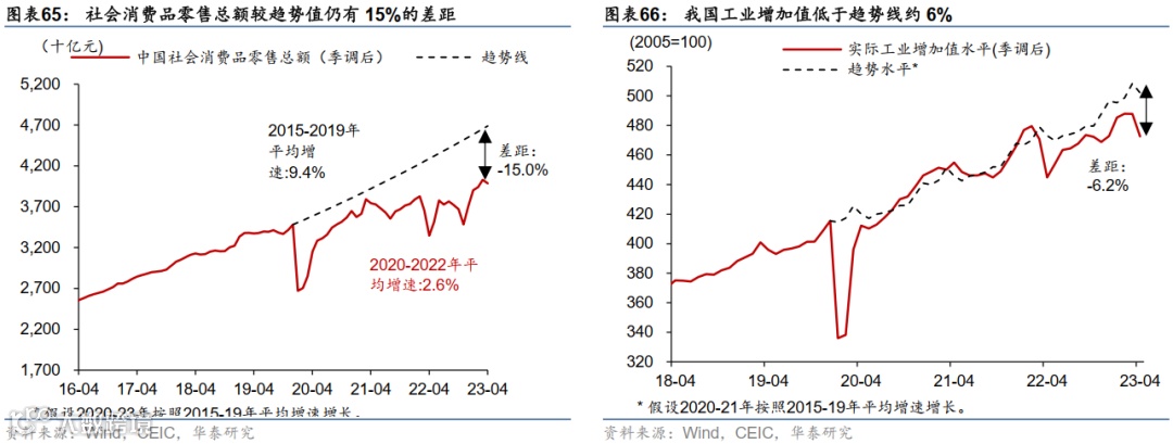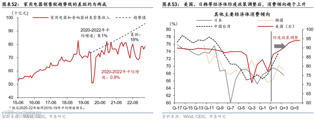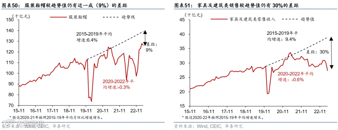 另一方面,消费中家具家电等地产产业链相关消费仍然成为拖累,除了餐饮外,服装鞋帽的增速后劲略显不足(图表50),而建筑装潢等与地产产业链较为相关的消费距离趋势值的差距呈现进一步下滑。截至2023年4月,家具及建筑类零售较16-19年趋势值的差距进一步走阔至30%,而家电距离趋势值的差距亦未见明显收窄,显示地产周期下行对消费的拖累或仍待修复(图表51和52)。根据测算,家具、家电及装潢材料等,三项狭义的地产相关零售板块在2022年约占GDP的1.1%,而地产相关消费产业链,包括建筑装潢和置业相关消费,可能滞后房地产销售增长1-2个季度回升。