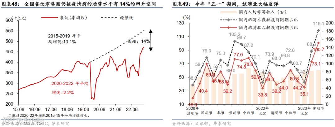 消费中出行链表现较为亮眼,今年居民出行活动持续处于高位,餐饮、旅游等线下体现式消费迎来较好表现。截至2023年4月,餐饮消费距离2017-2019年的趋势值水平大幅收窄(图表48)。此外,作为疫情政策优化之后第一个“五一”小长假,国内旅游出行人数及总收入均超过2021及2019年水平,人均旅游消费较2021年提升近1成。据文旅部统计,2023年五一期间有2.74亿人次出游,旅游收入约1480亿元,较2021年同期旅游人数和总收入分别回升4.3%/25%,人均旅游收入贡献亦较2021年同期提升10%。而对比疫情前水平,旅游人数和收入按可比口径分别恢复至2019年同期的约119%/101%,人均旅游消费恢复至约85%(图表49)。