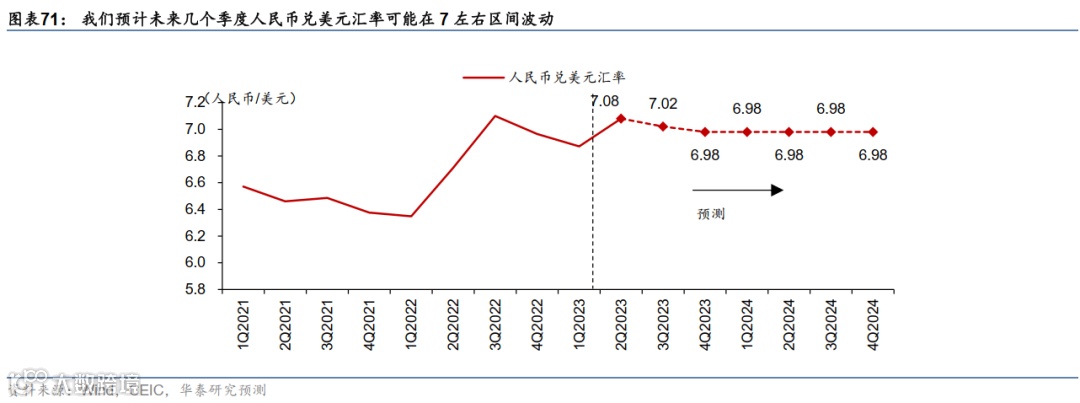 基于上述的增长路径及政策路径假设,结合海外高利率和增长不确定性并存的宏观环境,我们预计国内无风险利率(包括10年国债利率)可能有震荡下行的动力,人民币兑美元汇率在7左右区间波动。