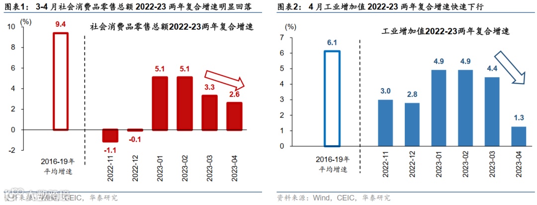 复盘2023年1-5月的总需求走势,内需回升在1-2月“开门红”后动能走弱,并在4月呈明显下滑趋势。虽然在低基数效应的推动下,今年3-4月的各项经济活动指标表观上呈现同比增长上升的局面,4月零售增长从3月的10.6%上升至18.4%,4月工业增加值增速录得5.6%,然而,去除较低的基数效应后,3-4月经济增长动能呈减弱的态势,尤其内需。用2022-23两年复合增长衡量,3月后消费、投资、工业生产、地产需求等一系列指标的增长动能明显再度弱化——具体看,社会消费品零售总额两年复合增速从1-2月的5.1%下降至3月的3.3%和4月的2.6%;工业增加值4月快速回落至近1.3% 的2022-23复合增长率,而此前1-2月曾一度攀升至4.9%,3月仍保持在4.4% 的复合增长率(图表1和2)。同时,投资两年复合增长率也从1-2月的8.8%下行至3月的5.7%和4月的2.7%,其中地产、基建和制造业投资增长均呈减速状态。