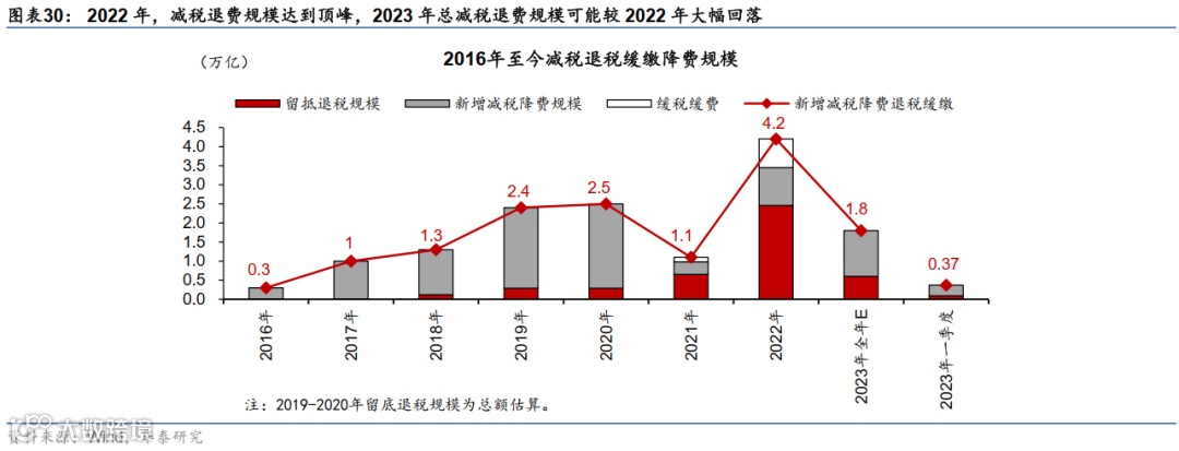 2023年1-4月中央+地方合并赤字(广义口径)为1.66万亿元,同比少增3,989亿元,显示年初至今财政扩张仍偏紧,地方政府债务上行及卖地收入回落或继续制约财政刺激力度。财政收入虽然增长、但主要受去年同期增值税大规模留抵退税导致的低基数效应,而2023年,大部分针对特殊行业(如汽车等)的减税降费政策已退出,针对制造业及困难行业的大部分缓税政策同样结束。留抵退税政策虽将在2023年延续,但完成规模或将较去年大幅收窄。