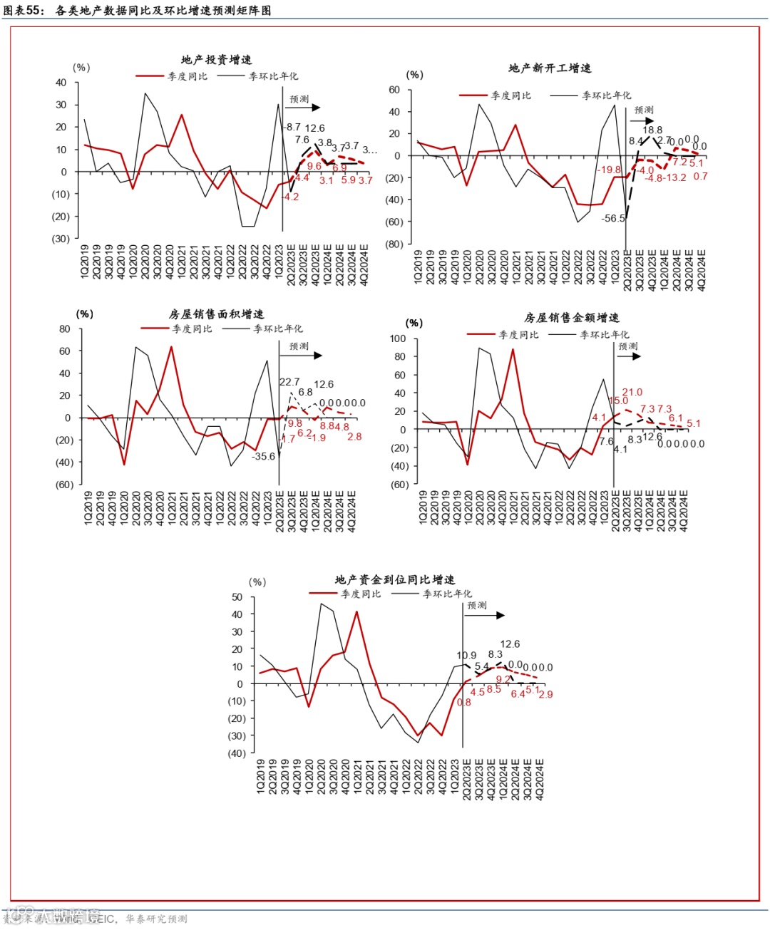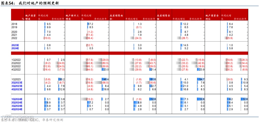 固定资产投资方面,我们将全年固定资产投资增速从此前预测的8-9%下调至约5%,而2024年或将继续回落至4%左右。在年初中央政府项目及配套款项下放后,基建投资有所减速。同时,与企业盈利周期紧密相关的PPI维持低位,去库阶段工业企业利润仍然承压,导致制造业投资扩产意愿不足。更为重要的是,房地产投资相关的地产新开工和土地交易仍然偏冷,因此整体投资增速较去年呈现小幅回落。地产投资为本次调整中的最大拖累项,具体预测调整如下(图表54):