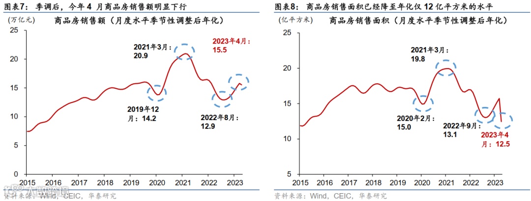 内需相关指标中,3月下旬后地产及相关需求势能下行的速度及影响尤为值得关注——与之相关的是,信贷扩张强度也快速下行。地产去杠杆带来的“供需两弱”局面之外,去年疫情对地产需求的影响也较为显著。在去年12月防疫政策优化后,我们观察到地产需求在今年1-2月出现了明显的反弹,成交量和成交额(季节调整后)较12月回升近10%,商品房销售面积两年复合同比增长从去年12月的-24%回升至今年1-2月的-6.6%,然而,3月回升动力明显减弱,而4月销售量绝对值几乎已经回落至去年4月较低的基数水平上。由此,成交量两年复合增长2023年3月下行至-9.3%,4月大幅走弱至-28.2%,而销售金额两年复合增长也从3月的-10.4%明显走弱至4月的-23.3%(图表5和6)。季节调整后,今年4 月的月度商品房销售额明显下行,而销售面积已经“跌穿”2022年9月低点,达到了年化仅12.5亿平方米的水平(图表7 和 8 )。