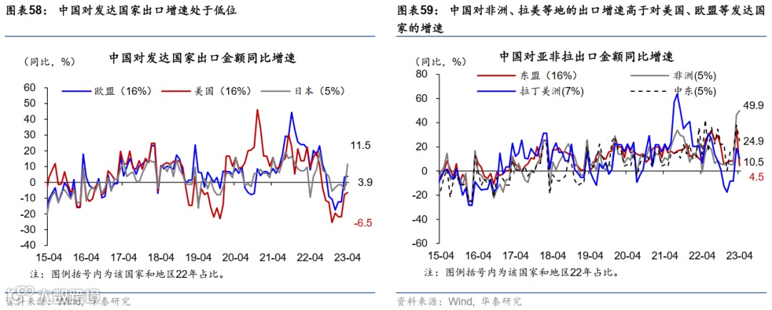 中国出口保持韧性的原因是中国制造业具备全方位效率和成本优势,且产业链不断升级。3-4月锂电池、太阳能电池和电动汽车等“新三样”高技术产品对出口的贡献达2.1个百分点(图表57)(参见《中国出口产业链的升级与重塑》,2023/4/17)。往前看,中国竞争力还将继续提升,尤其是中国企业有望开拓广阔的亚非拉市场,23年以来中国对非洲、拉美等地的出口增速高于对美国、欧盟等发达国家的增速(图表58和59),中国对亚非拉的出口有望部分对冲欧美需求的下行。