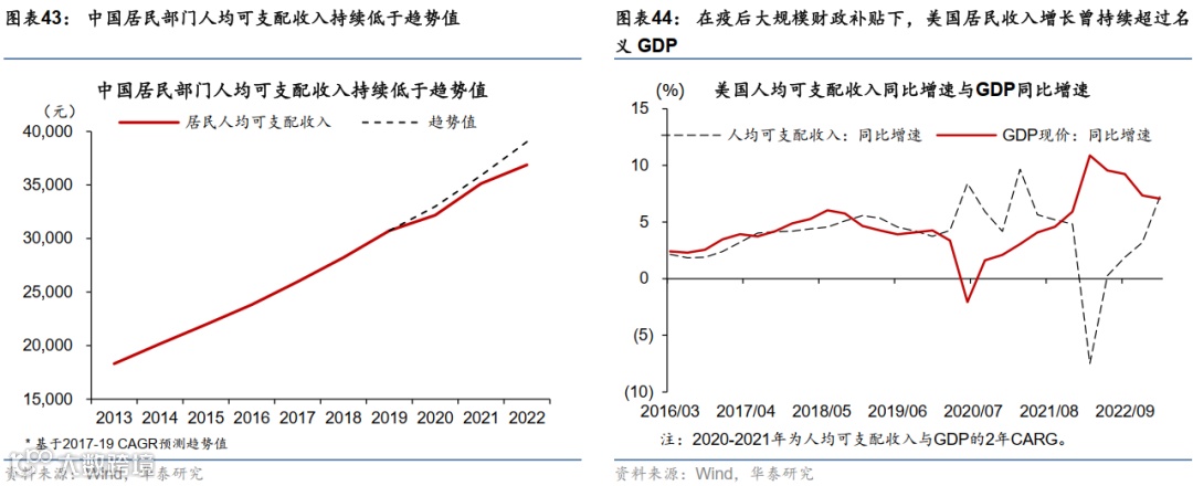 经济复苏后居民收入回升总体偏慢、叠加消费倾向修复缓慢,可能制约消费支出的回升幅度。如前文所述,与其他国家疫情后复苏的经验相比,中国经济复苏后劳动参与率和产能回升较快,但内需恢复动力不足,导致居民收入回升总体偏慢、劳动者报酬占GDP的比例呈下降趋势。图表43和44显示,2020年以来,中国居民部分的人均可支配收入持续低于趋势值,而在疫后大规模财政补贴下、美国居民收入增长曾持续超过名义GDP。同时,对未来的预期不确定下,疫情期间明显受到压制的消费倾向亦呈现缓慢回升,尚未恢复至疫情前的水平。