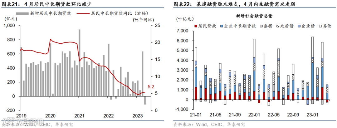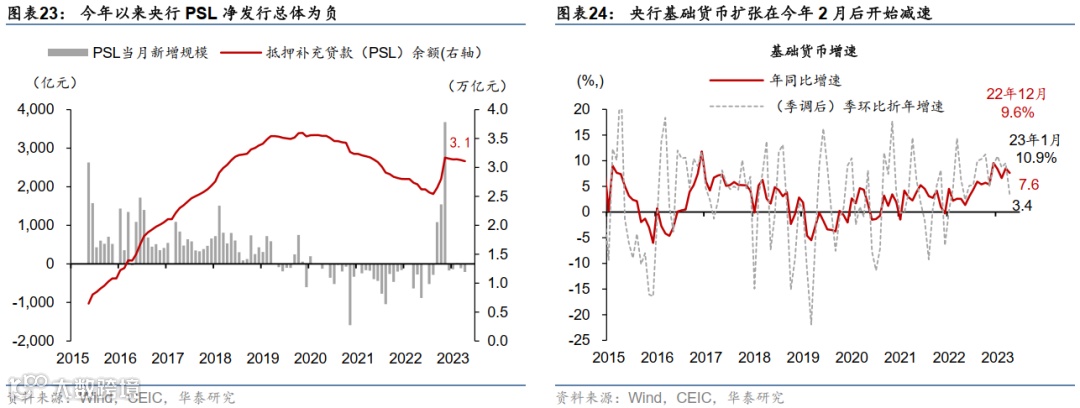 最后,从宏观数据观察,货币和财政对经济回升的支持力度在3月开始回落,4月明显下降。虽然从2022年12月的经济工作会议、到2023年4月底的政治局会议的一系列表述中,对逆周期调节政策的立场基本没有变化(参见《中央经济工作会议:促发展、重稳定》,2022/12/17;《增长目标5%左右,政策执行或留空间》,2023/3/5;《“乘势而上”稳内需》,2023/4/28),但在实际行动层面,我们观察到货币和财政的“主动宽松”力度均有所走弱。图表23显示,央行PSL的净发行在今年以来总体为负,而2022年10-11月期间扩张力度最大。历史上,PSL发行往往和政府逆周期调节的实际发力时点吻合。图表24显示,央行基础货币扩张(如再贷款等)在今年2月后也开始减速,对整体货币创造和信贷周期的支撑力度有所下降。财政层面,财政存款增长在3月后再度加速,显示财政宽松力度边际下行,对货币创造也形成一定压制;此外,财政月度收支缺口在3月后收窄、2023年4月明显收缩,其中,财政存款在4月同比多增4,618亿元,同比增速从3月的-1.9%回升至6.6%,显示财政资金下放速度边际减弱,同时,4月税收增长大幅回升,两年复合增长看,财政去年留抵扣税的宽松效果在今年4月增值税增长大幅回升后被部分腐蚀(参见《财政扩张力度有所下行》,2023/5/18)。