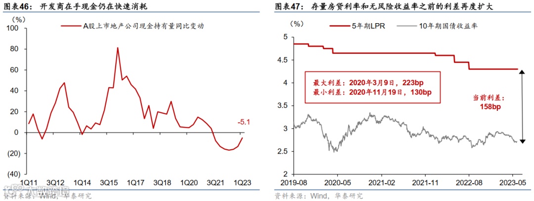 此外,存量房贷利率仍偏高,或影响居民购房需求。对居民而言,尽管2023年1季度新增加权房贷利率自2021年4季度高点下行149bp,居民新购住宅房贷利率下行提振了购房需求;但5月存量房贷利率(5年期LPR)较无风险收益率(10年期国债利率)的利差仍超过150BP,且仍在持续扩张。在今年居民收入和资产价格仍存在不确定性的情况下,已负担房贷的居民可能选择增加储蓄及降低房贷支出(债务),最终加剧居民主动缩表(图表47)。