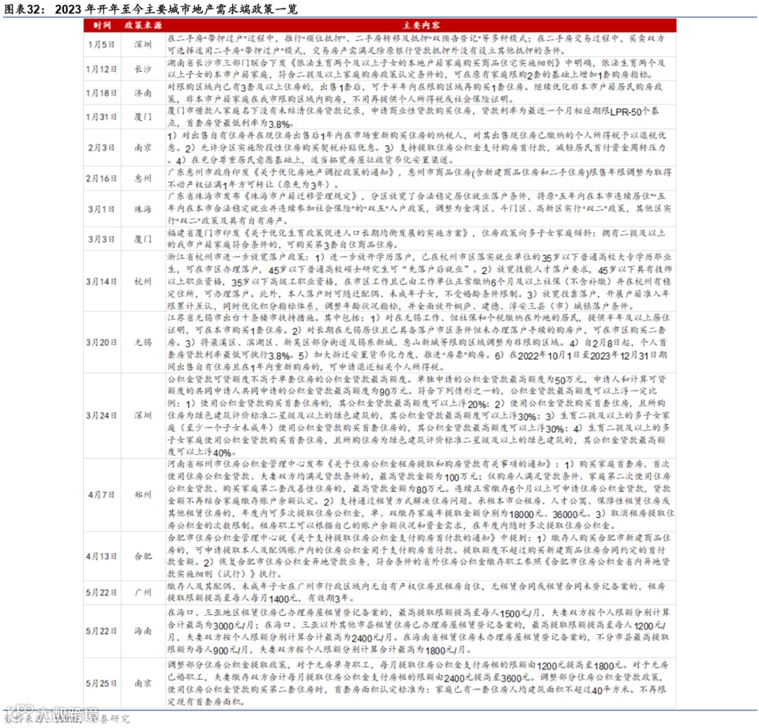 1. 支持首套房及改善型住房需求的政策有望进一步放松。2023年开年以来,全国多地继续放宽首套及二套房限购限贷政策,地产需求端政策继续发力(图表32):杭州、南京等二线城市均不同程度地缩小居民限购范围,而合肥、宁波等地则通过调整公积金贷款额度等方式促进居民购房需求释放。我们认为,部分城市需求端限购限贷政策可能在2023年下半年到2024年继续有所调整以促进居民改善性需求继续释放,不排除一线城市跟进的可能性。