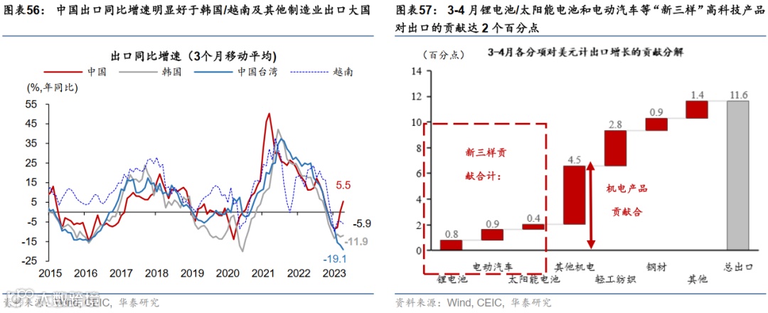 外需方面,我们认为中国出口仍将保持韧性,但随着海外衰退概率的上升、外需动能或逐步放缓,预计2023年(以美元计)名义出口增速将从22年的7%降至2-4%,24年进一步转负至-1%到-2%。今年1-4月中国出口增速明显好于韩国、越南等其他制造业出口大国(图表56),1季度贸易顺差对名义GDP的贡献达1.6个百分点。