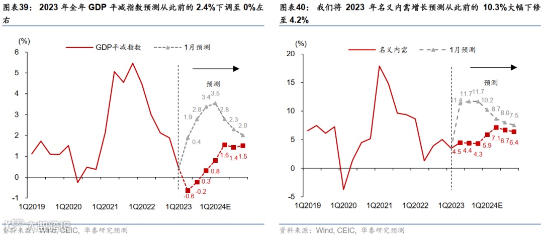 我们将2023-24全年实际GDP增长预期从此前的6.2%/5.8%下调至6.0%和5.0%,并将2023年名义GDP增速预测下调2.8个百分点至6.0%、隐含通胀预期下修。鉴于2023年1季度实际GDP同比达4.5%,超出我们此前3.6%的预期,我们本次对2023年2-4季度实际GDP增长隐含下调幅度更大。预计4季度受到内需总体偏弱、外需不确定性上升拖累而环比走低、对2024年增长形成更大拖累。下调内需增长外,我们将2023年CPI和PPI年均预测分别下调至0.9%和-2.3%,全年GDP平减指数或降至0%左右。