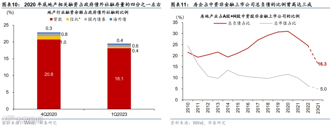 由此,开发商现金流修复还未开始,似乎就已经中断,且整体信贷周期承压。图表9显示,开发商资金到位虽然在今年1-2月环比有所改善,但同比在低基数的基础上年初至今仍在收缩。从两年复合增长(收缩)的角度衡量,开发商资金到位同比从去年12月-23.7%的两年复合增长,恢复到今年3月的-11%,但今年4月再度掉头下行至-18.4%。值得注意的是,开发商此前20年形成了“高杠杆、高周转”的运作模式,而当现金流连年双位数快速收缩后,结果必然是快速(被动)去杠杆。由于2020年底地产相关融资(不包括地产为抵押的间接融资)占政府债外社融存量四分之一左右,而占中国非金融企业总负债曾达三成,所以,当开发商去杠杆之时,信贷周期会有一个向下的“地心引力”(图表10和11)—— 今年3月开始,社融增长开始环比减速,而4月社融环比增长陷入“紧缩”区间(月环比年化扩张率仅7%左右)。具体看,居民中长期贷款再度明显收缩,而票据融资和企业债发行也明显收缩(参见《地产需求再度走弱,4月社融不及预期》,2023/5/11)。往前看,如果地产周期疲软的趋势不改,地产去杠杆可能“任重道远”,对信贷周期也可能产生较为持续的紧缩效应。
