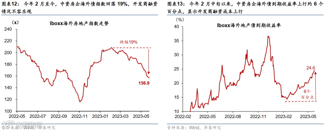 随着现金流恢复的“中断”,地产商的融资环境也再度恶化。图表12和13显示,开发商债券指数在去年11-12月的快速反弹后再度回落,而融资成本也再度攀升——以开发商海外债为例,有效利率再度突破20%。结合近期人民币随着复苏动能趋缓而边际走弱,开发商本币计算的融资成本达到20%以上,结合两位数速度收缩的现金流,开发商的偿债能力再度快速被腐蚀。