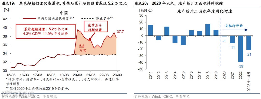 从经济自身修复动能层面,我们第一部分列举的数据及其趋势显示,居民和私有经济主体部门对未来增长和收入的信心有待进一步巩固。虽然防疫政策优化后,居民消费倾向有所回升(参见第一部分的图表16和17),但总体距离疫情前的趋势水平还有较大的距离。从另一个角度看,消费倾向偏低意味着,居民端的储蓄率仍然居高不下。图表19显示,居民超额储蓄仍在累积,显示居民防御性储蓄的意愿仍较强。值得注意的是,宏观层面的“储蓄”概念指的是可支配收入用于消费之外的所有其他“配置”,包括投资、购房、也包括还(房)贷。同时,企业端,盈利增长偏弱——1-4月工业企业盈利增长-20.6%,而今年1季度沪深300上市非金融企业利润同比降幅为5.8%。各项指标显示企业对未来的信心有待进一步巩固——比如,开发商购置土地和开工均继续收缩(图表20),但完工的年化水平已经达到2020年底的高点,显示开发商“防御式”缩表意愿较强(后文第五部分将进行更为详细的论述);再举例,劳动力工作时长在防疫政策调整后上升,但企业扩招意愿弱,显示企业长期扩张和投资的动力仍然较弱。