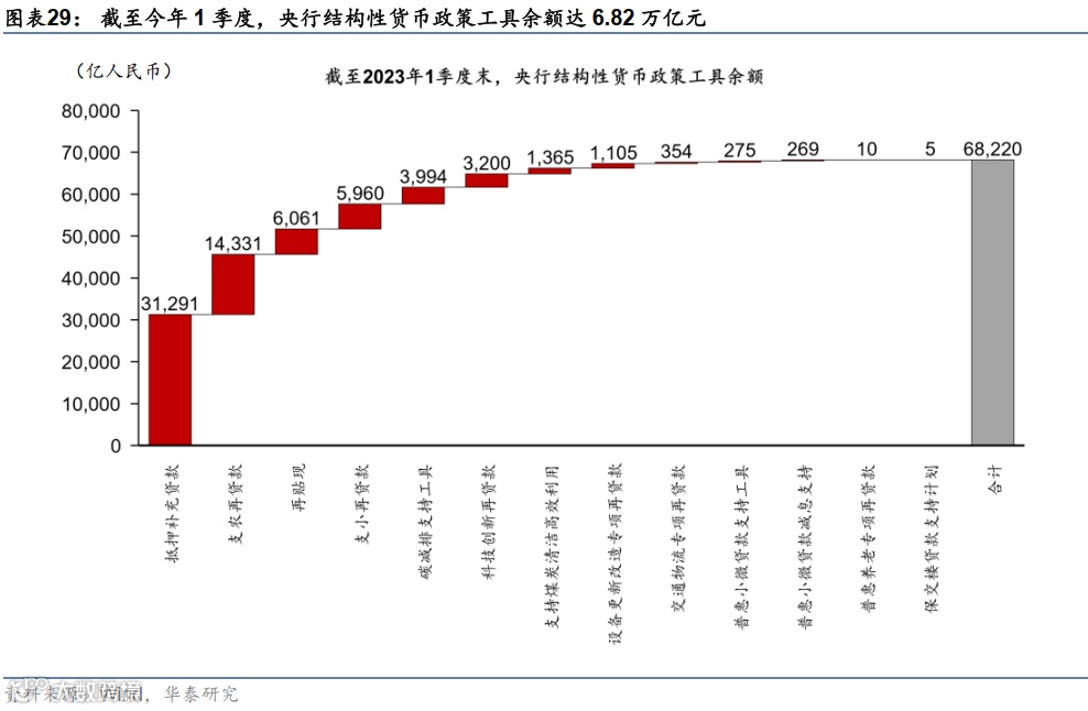 结构性政策工具可能继续承担货币政策稳增长的主力,主要支持方向可能仍是地产去库存、保障性住房需求、战略新兴产业、绿色金融等。截至今年1季度末,央行结构性政策工具余额达6.82万亿元,较去年4季度6.45万亿元继续上行(图表29)。考虑到央行强调结构性政策工具“聚焦重点、合理适度、有进有退”,我们预计今年结构性政策工具投放基础货币的力度可能略弱于22年。在主要发力方向上,稳地产可能仍是结构性货币政策的重点。虽然保交楼贷款支持计划实施期已于今年3月结束,但央行在今年1月新设立800亿元额度的房企纾困专项再贷款以及1000亿元额度的租赁住房贷款支持计划,分别支持金融资管公司并购存量地产项目、以及住房租赁市场和保障性住房需求发展。同时,PSL也有重启的可能。此外,支持战略新兴产业来提升经济发展安全,以及推动绿色金融发展来实现中长期双碳目标或将继续是结构性货币政策工具的重点发力领域。