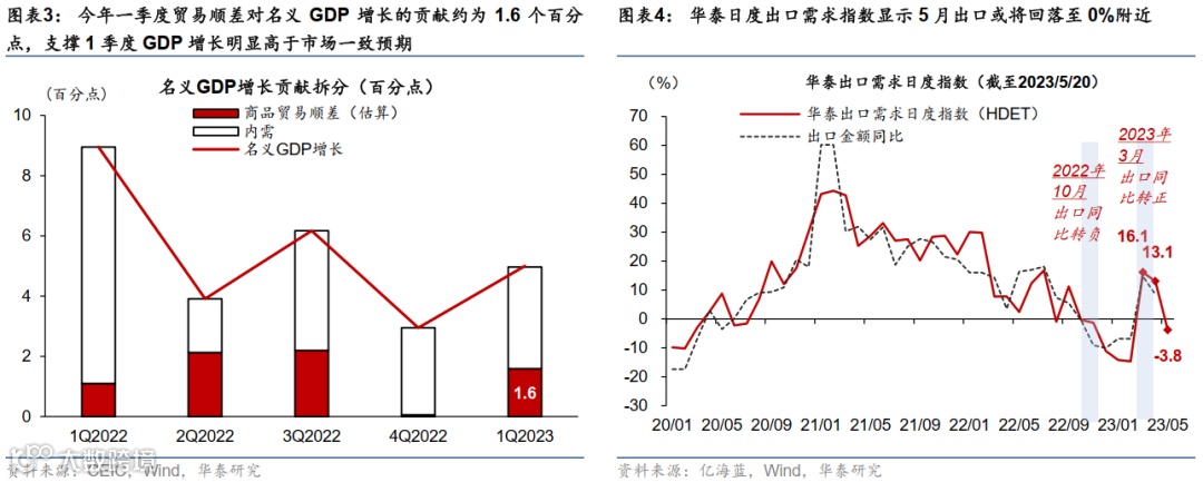 5月目前为止的高频指标显示,内外需的环比增长速度在5月可能进一步下行,而2022-2023两年复合增长率5月可能继续低于4月。比如,万得数据显示5月前20天30城商品房成交面积同比上升6.6%,5月上旬发电量同比8.9%,而我们外需的高频监测指标、华泰日度出口需求指数(HDET,参见《高频到日度:华泰独家出口监测指标》,2023/4/23)显示,此前经济增长中最大的“惊喜”和亮点,出口增长也可能在5月从3月的14.8% 和4月的8.5%(美元计),降至5月的0%左右,甚至可能在6月再度转负。此处值得一提的是,(净)出口增长超预期,可能是支撑1季度GDP增长明显高于万得一致预期的最主要因素,也是中国经济疫情后恢复和其他经济体一个非常与众不同的特点(图表4)。这个与众不同的特性,一方面彰显了中国出口的韧性和竞争力(参见《中国出口产业链的升级与重塑》,2023/4/16),另一方面,也反映了内需回升总体势能较弱、再通胀动能不强的特点(即价格较低强化了中国出口产业的竞争力)。这在后文会进一步展开。