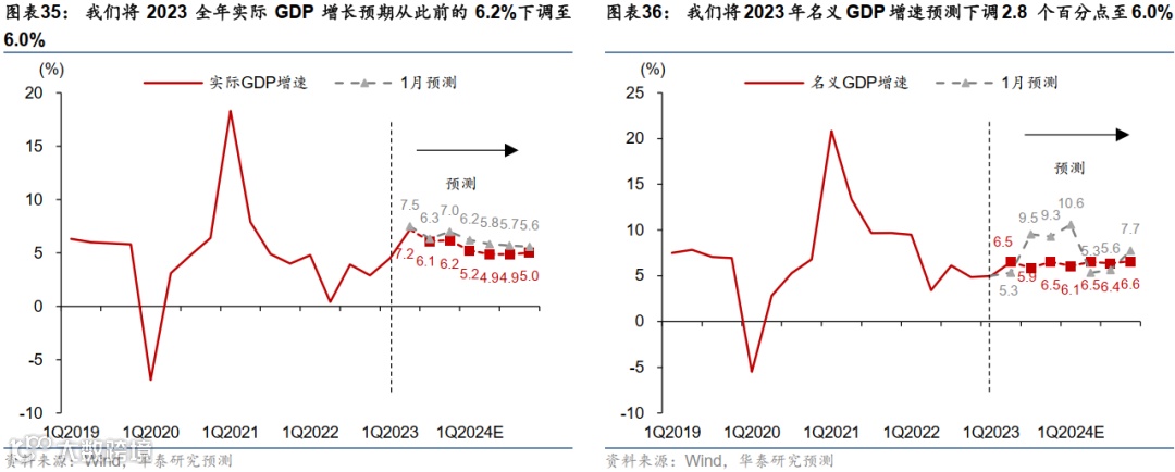 将2023全年实际GDP增长预期从此前的6.2%下调至6.0%(图表35,参见《上调2023年增长预测至6.2%》,2023/01/29)。鉴于2023年1季度实际GDP同比增速达到4.5%,超出我们3.6%的预期,由此,我们本次下调隐含的对2023年2-4季度实际增长的下调幅度更大。