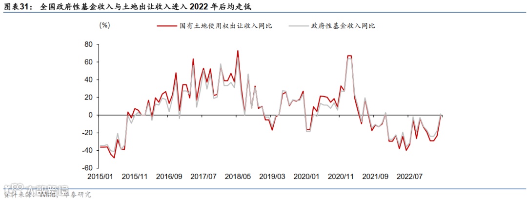 此外,房企现金流改善可能带动2023-2024年土地成交金额及土地购置费同比增速有所回升。2023年1-4月,受开发商现金流仍未明显恢复的影响,土地出让金额仍处低位,累计同比下行21.7%。随着地产商在手现金流边际改善,地产商拿地意愿可能随地产新开工同步上行。此外,2022年43城调降土拍门槛,上海等地取消招挂复核打分入围方式,可能继续吸引有拿地意愿但在资质或融资端存在困难的企业买地,进而减少土地流拍现象,抬升土地成交增速。土地成交金额边际回暖,将有助于缓解地方政府财政压力。