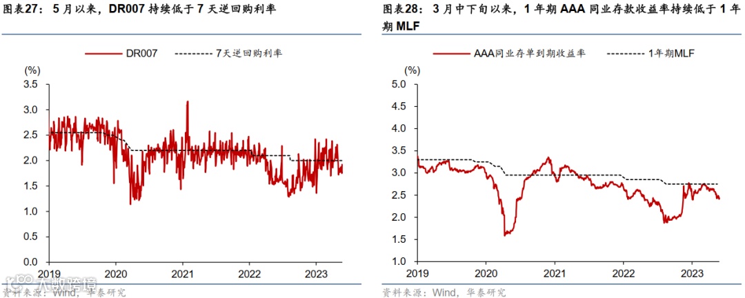 具体看,货币方面,今年下半年到明年上半年央行可能“顺势而为”微幅(或为约每季度10个基点)下调政策利率,同时今年3季度可能会再次小幅(25个基点一次)降准。近期市场利率已持续低于政策利率水平,如5月以来DR007在1.7%-1.95%之间震荡、持续低于2%的7天逆回购政策利率(图表27),而3月中下旬以来,1年期AAA同业存单利率持续低于2.75%的1年期MLF利率(图表28)。随着7月政策或进入“稳增长”窗口期,央行可能会“顺势而为”调降政策利率。在降息节奏上,央行可能会像今年1季度《货币政策执行报告》所强调的、采取“缩减原则”,或在接下来3个季度每季度下调约10个基点。此外,央行可能会在今年3季度小幅降准25个基点,以降低商业银行的融资成本。然而,考虑到当前实体经济的融资成本已处于2008年以来历史低位,进一步降准降息对经济的提振作用可能相对有限、信号意义可能大于实质。