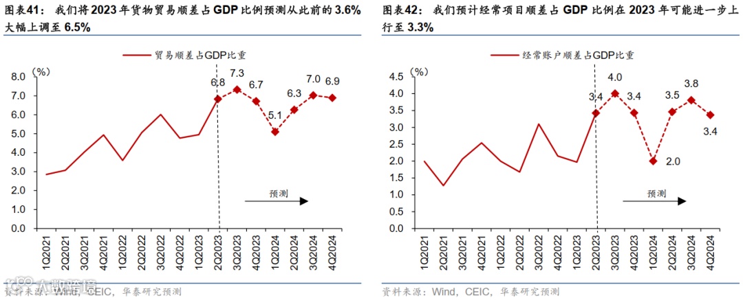我们将2023年货物贸易顺差占GDP比例预测从此前的3.6%大幅上调至6.5%,而经常项目顺差占GDP比例在2023年可能进一步上行至3.3% (此前预期为下降至1.9%;图表41和42)。这一预测调整不仅隐含着我们对中国出口需求韧性的判断(参见《中国出口产业链的升级与重塑》,2023/4/16)、也计入了比此前更为保守的进口增长预期 (图表34)。由此,货物贸易顺差和经常项目顺差占比均在2022年较高水平基础上继续上行,对增长贡献的预测也由负转正,为2023年增长最大亮点。