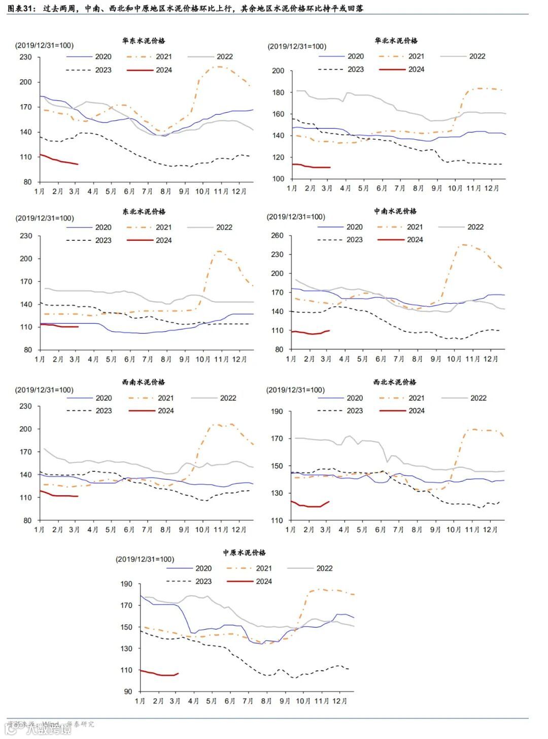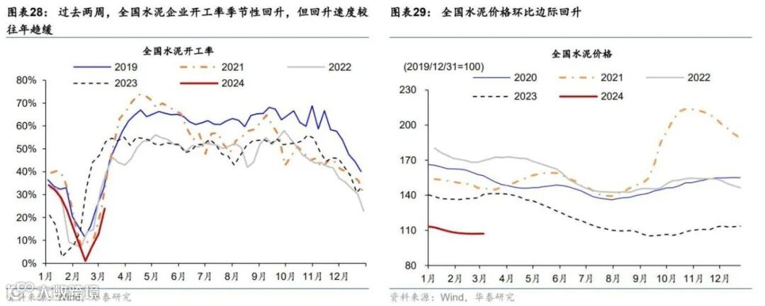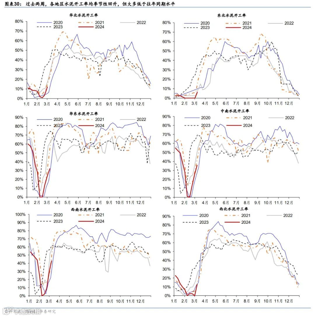 近两周,全国水泥开工率节后回升速度慢于往年,同期水泥价格环比小幅上行。供给端,全国水泥企业开工率较两周前环比上行17个百分点至23.9%,但低于往年同期(图表28)。分区域看,全国各地区水泥企业开工率均环比回升,但大多不及往年同期水平(图表30)。价格端,全国水泥价格过去两周边际回升,环比上行0.1%(图表29)。分区域看,过去两周,中南、西北和中原地区水泥价格环比上行,华北、东北地区水泥价格环比持平,而华东和西南地区水泥价格有所回落(图表31)。