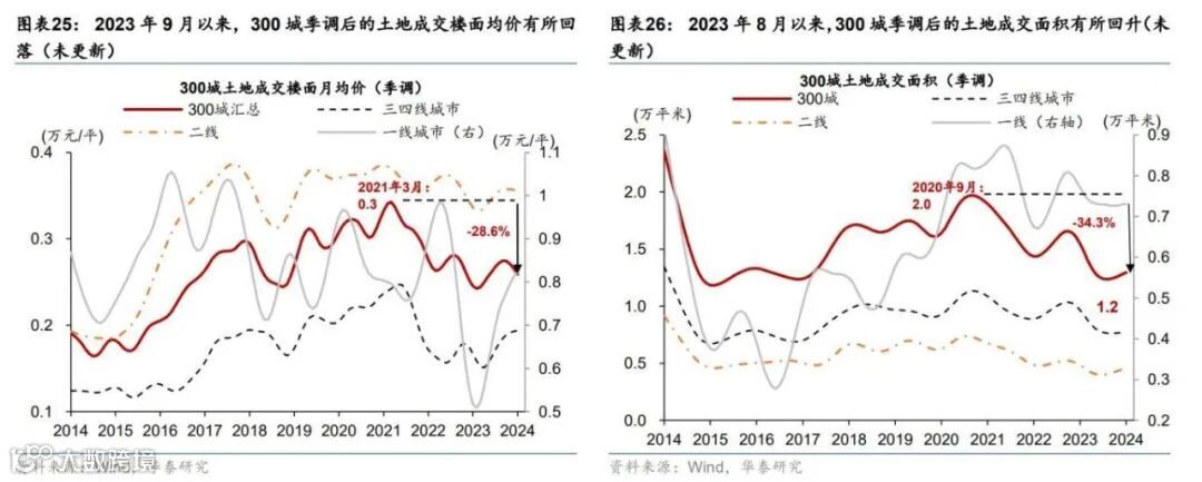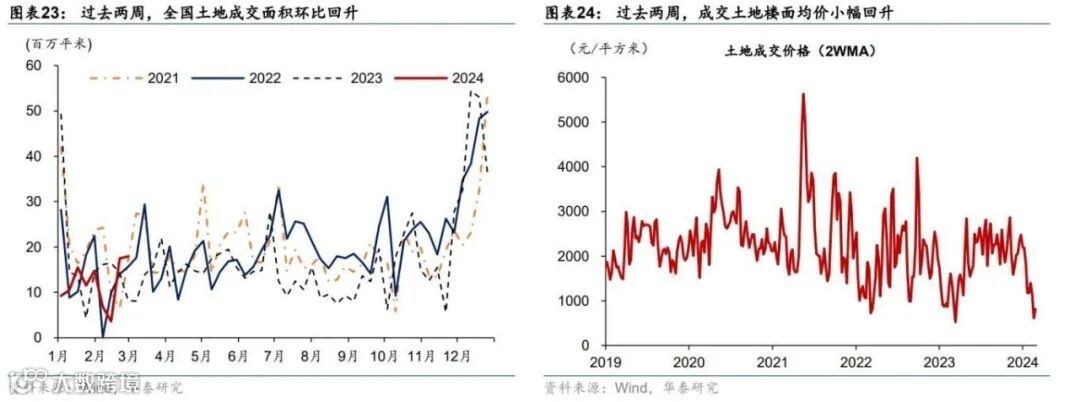 过去两周,全国土地成交量价齐升,土地出让收入边际改善。具体看,过去两周,百城土地成交面积环比回升2.4倍,同比亦在高位,较2021/2023年同期高51%/57%(图表23);成交土地楼面均价较两周前小幅回升(图表24)。去年4季度以来,季调后的300城土地成交呈现量涨价跌的趋势(图表25和26)。截至2024年1月,300城土地成交面积/楼面月均价分别较高点回落34.3%/28.6%。与此同时,土拍市场继续呈现向一线城市集中的趋势,自2023年年初以来,季调后的一线城市的土地成交价格回升速度较快。分省市看,2024年年初至今,厦门、济南、兰州、青岛的累计土地成交面积同比增长超过2倍,而太原、大连、贵阳和长春累计土地成交面积同比降幅超过7成(图表27)。