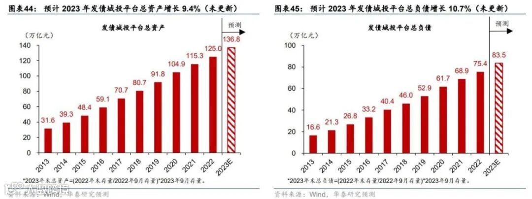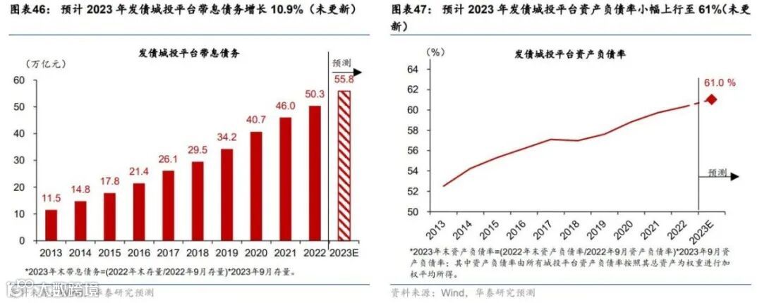 预计2023年发债城投平台总资产达136.8万亿元,同比增长9.4%(图表44);预计2023年总负债达83.5万亿元,同比增长10.7%(图表45),其中2023年带息债务达55.8万亿元,同比增长10.9%(图表46)。由此,预计2023年发债城投平台资产负债率达61%,较2022年上升0.7个百分点(图表47)。