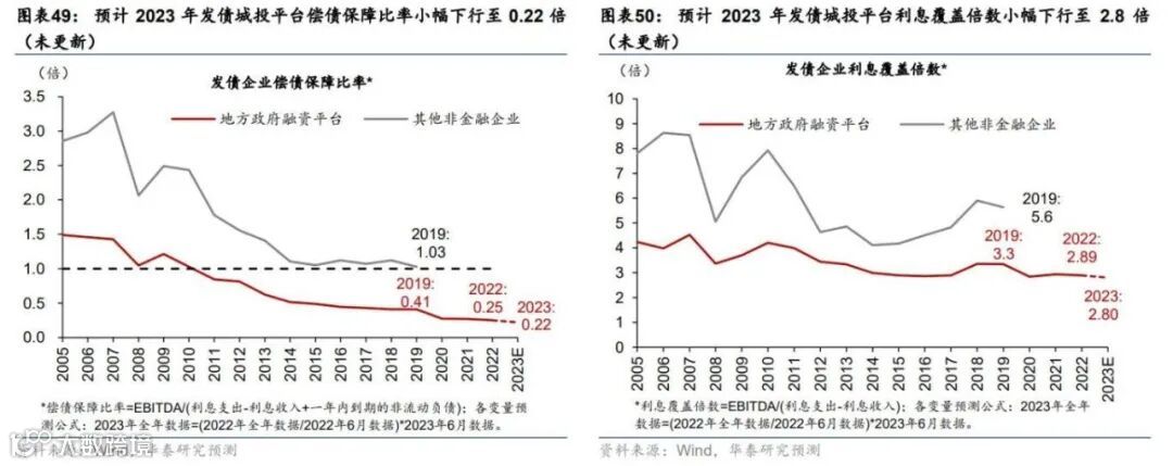 预计2023年发债城投平台偿债保障比率从2022年的0.25倍下行至0.22倍,利息覆盖倍数从2022年的2.89倍下行至2.8倍,显示发债城投平台偿债能力边际恶化(图表49和50)。