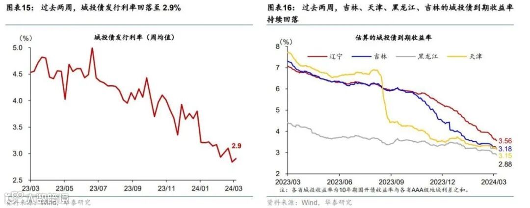 过去两周,城投债发行利率总体环比小幅回落,自2023年6月末以来总体回落超过210个基点。过去两周,城投债发行利率环比小幅回落至2.9%的水平(图表15)。分省层面,我们使用各省城投债的地域利差+10年期国开债到期收益率来估算各省城投债的到期收益率;过去两周,债务风险相对较高的省份的城投债到期收益率均呈下行趋势。