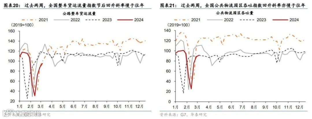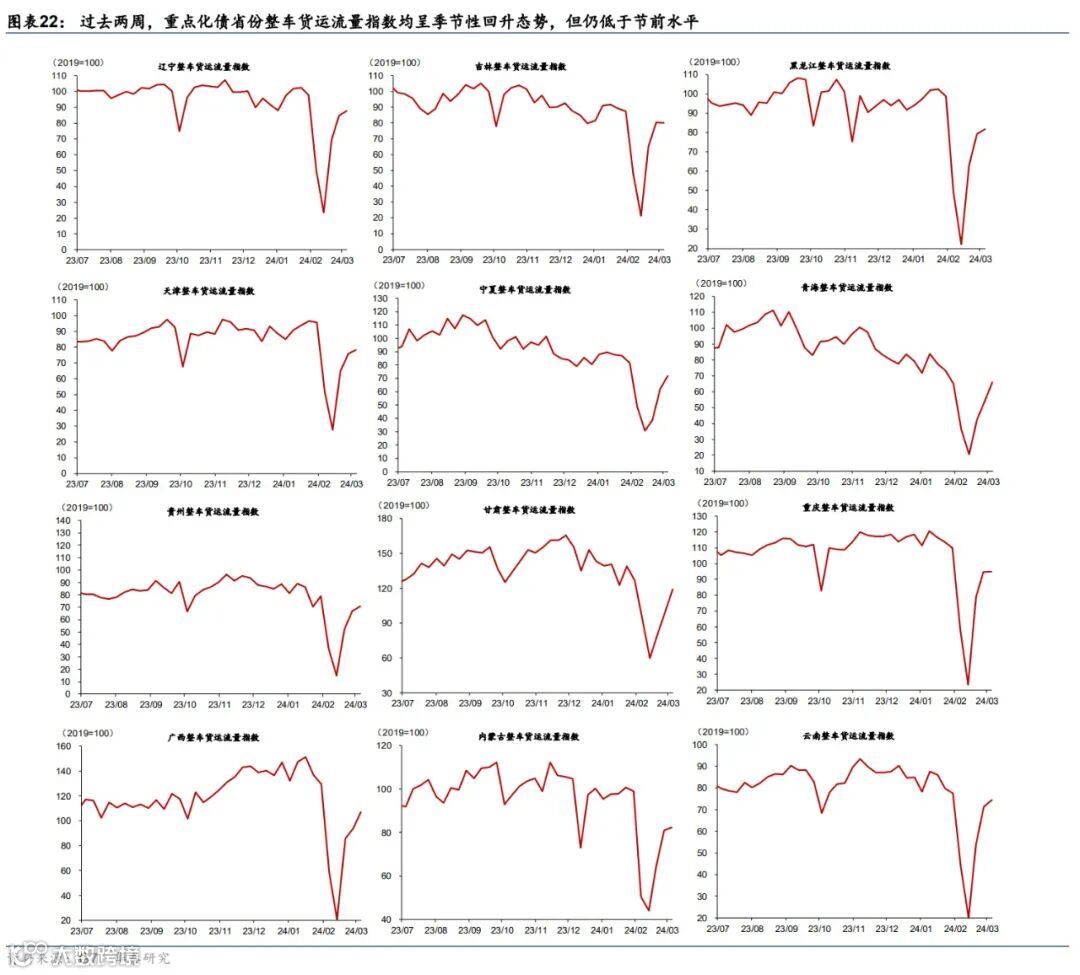 近两周,全国及重点化债省份物流指标节后回升斜率不及往年同期。过去两周,公路整车货运流量指数环比回升32.9%,春节对齐后较去年同期回落1.8%,且低于往年同期(图表20)。同时,公共物流园区吞吐景气指数较两周前环比回升20.4%,春节对齐后同比回升1.6%,但低于2021-2022年同期(图表21)。分省看,过去两周,所有重点化债省份整车货运流量指数均呈季节性回升态势,但仍低于节前水平(图表22)。