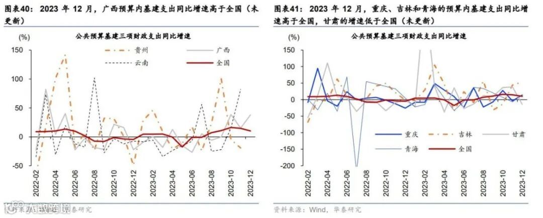 去年12月,已公布数据的重点化债省份加权平均预算内基建支出增长19.2%,高于全国10.1%的平均增速,但各省走势分化。去年12月,全国一般公共预算支出中,与基建相关的农林水事务、交通运输和节能环保支出合计同比增长10.1%,主要受益于去年同期的低基数,而两年复合增速为2.5%。去年12月,已公布数据的重点化债省份广西、重庆、吉林、青海和甘肃五省加权平均预算内基建支出增长19.2%,高于全国,其中广西、重庆、吉林、青海预算内基建支出增速高于全国,而甘肃增速低于全国(图表40-41)。