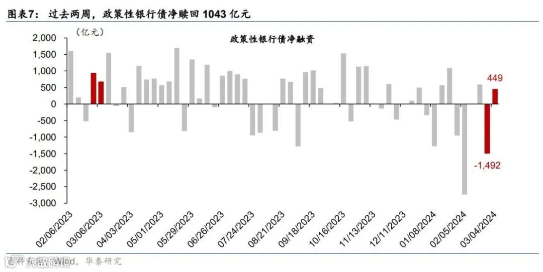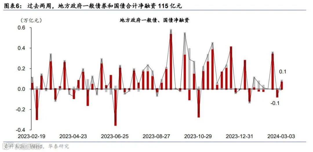 地方一般债及国债:过去两周,地方政府一般债与国债合计净发行115亿元,其中国债净发行50亿元,地方一般债净发行65亿元,国债发行环比大幅放缓(图表6)。年初至今,地方政府一般债与国债发行合计净融资6,985亿元,同比多增2,465亿元,其中地方一般债同比少增1,068亿元,而国债同比多增3,533亿元。