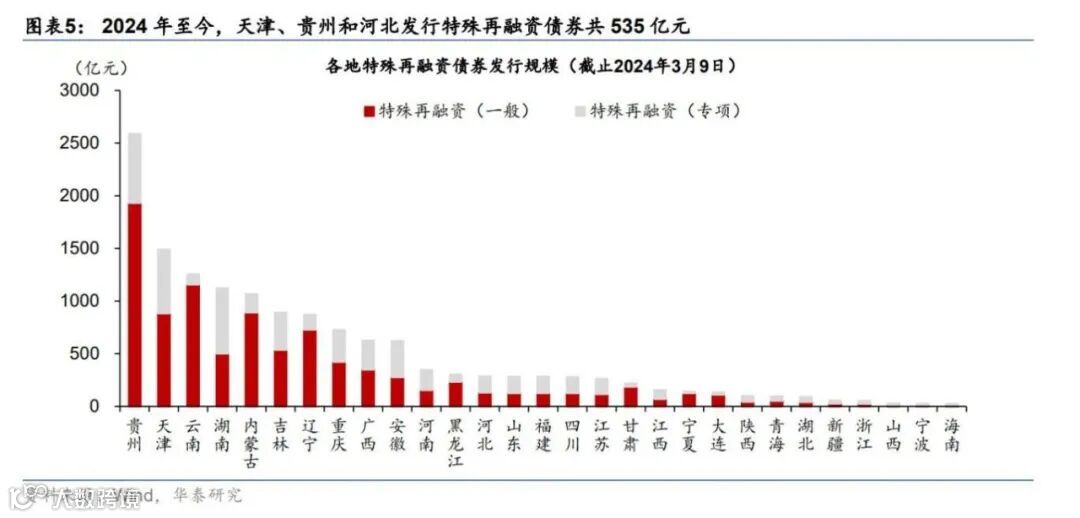 特殊再融资债:2024年1月底以来,特殊再融资债启动发行,共有贵州、河北、天津三个省市发行约535亿元特殊再融资债,近两周天津发行特殊再融资债券202亿元(图表5)。自2023年10月特殊再融资债发行以来,贵州省已累计发行2,588亿元特殊再融资债,在所有发债省市中位居前列。
