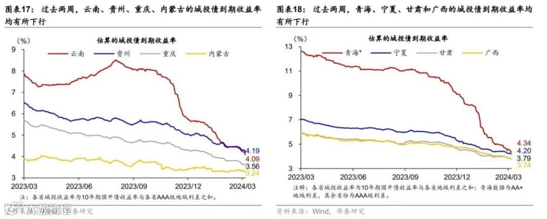 过去两周,城投债发行利率总体环比延续回落,自2023年6月末以来总体回落超过210个基点。分省层面,我们使用各省城投债的地域利差+10年期国开债到期收益率来估算各省城投债的到期收益率;过去两周,债务风险相对较高的省份的城投债到期收益率均呈下行趋势。