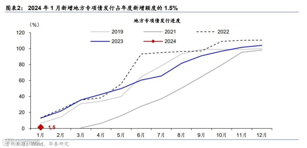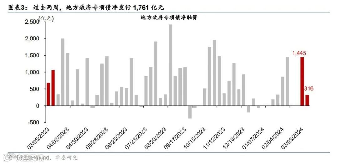 地方专项债:过去两周,地方专项债净发行1,761亿元,环比明显提速,且较节前两周亦多增557亿元,同比小幅多增22亿元。年初至今,共有广东、山东和江苏等22个省份发行地方政府专项债,净发行规模4,588亿元,较去年同期少增4,256亿元(图表3-4)。