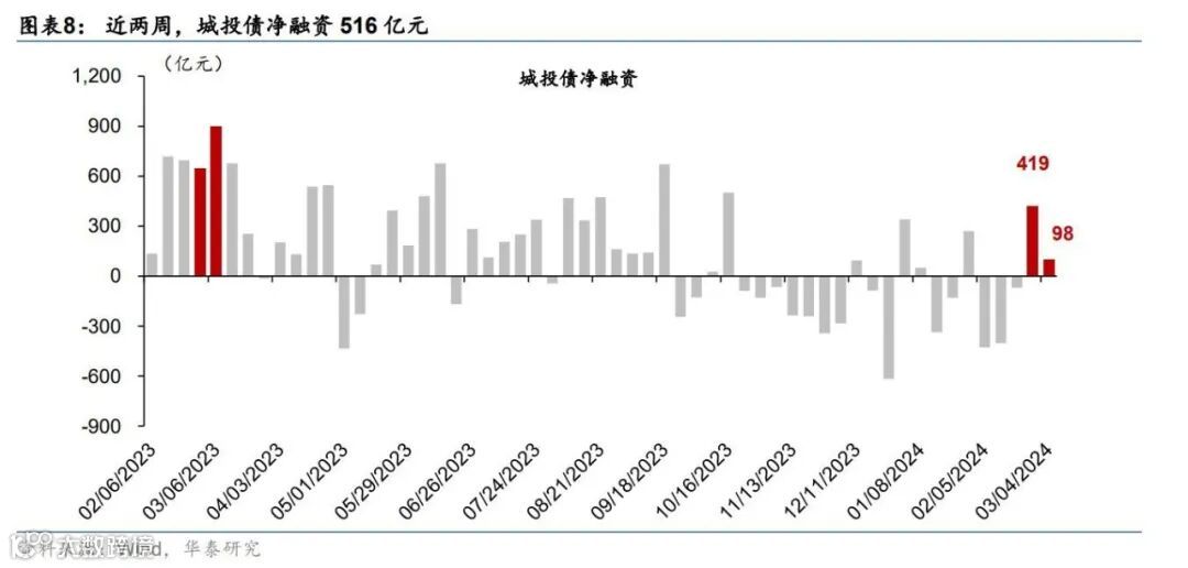 城投债:近两周,城投债由净赎回转为净发行态势,净发行额(516亿元)环比多增989亿元(图表8)。年初至今,城投债累计净赎回189亿元,较去年同期多减3,803亿元。