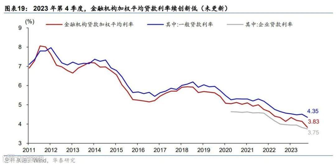 2023年4季度金融条件边际宽松,银行体系加权平均贷款利率续创历史新低。去年4季度银行体系加权平均贷款利率回落31个基点至3.83%,续创2008年公布数据以来的新低。其中,一般贷款利率季环比下行16bp至4.35%,而企业贷款利率季环比下降7bp至3.75%。随着贷款利率下行,银行净息差承压,去年4季度商业银行净息差跌破1.7%至1.69%。