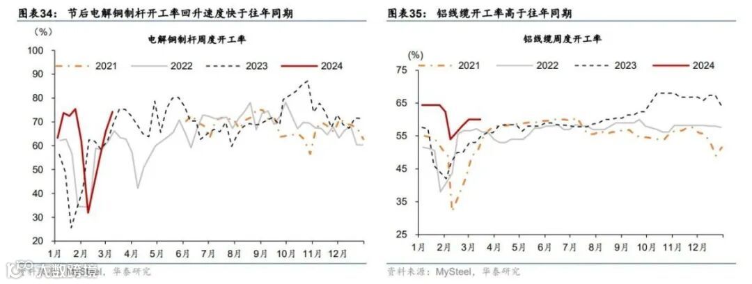 过去两周,电解铜制杆和铝线缆开工率超季节性回升,显示电力电气行业维持较高景气度。电解铜制杆开工率和铝线缆开工率主要应用于电网建设,可以反映电网投资的落地情况。电解铜制杆开工率近两周累计上行19个百分点,回升速度快于往年同期;铝线缆开工率较两周前环比小幅回升2个百分点,同比亦在高位(图表34和35)。