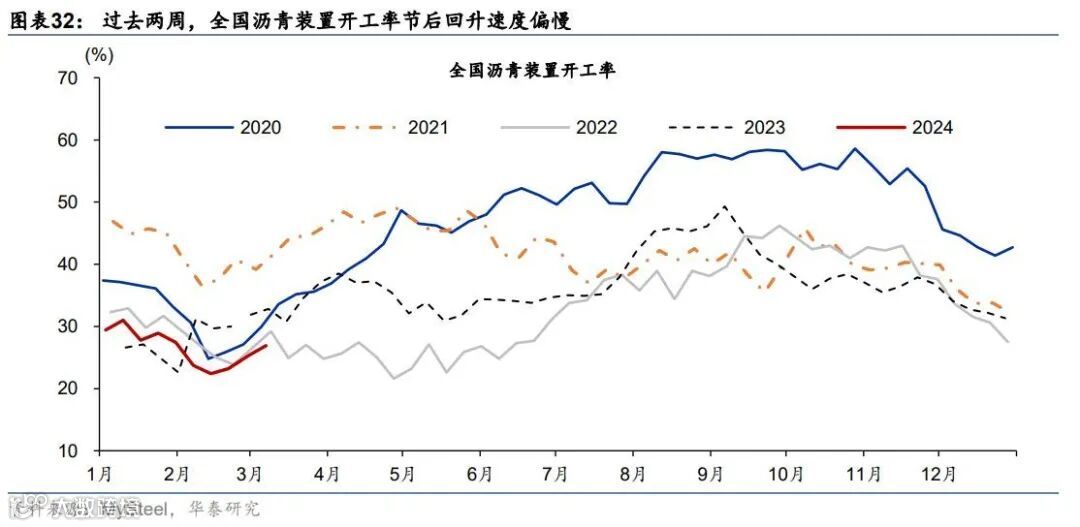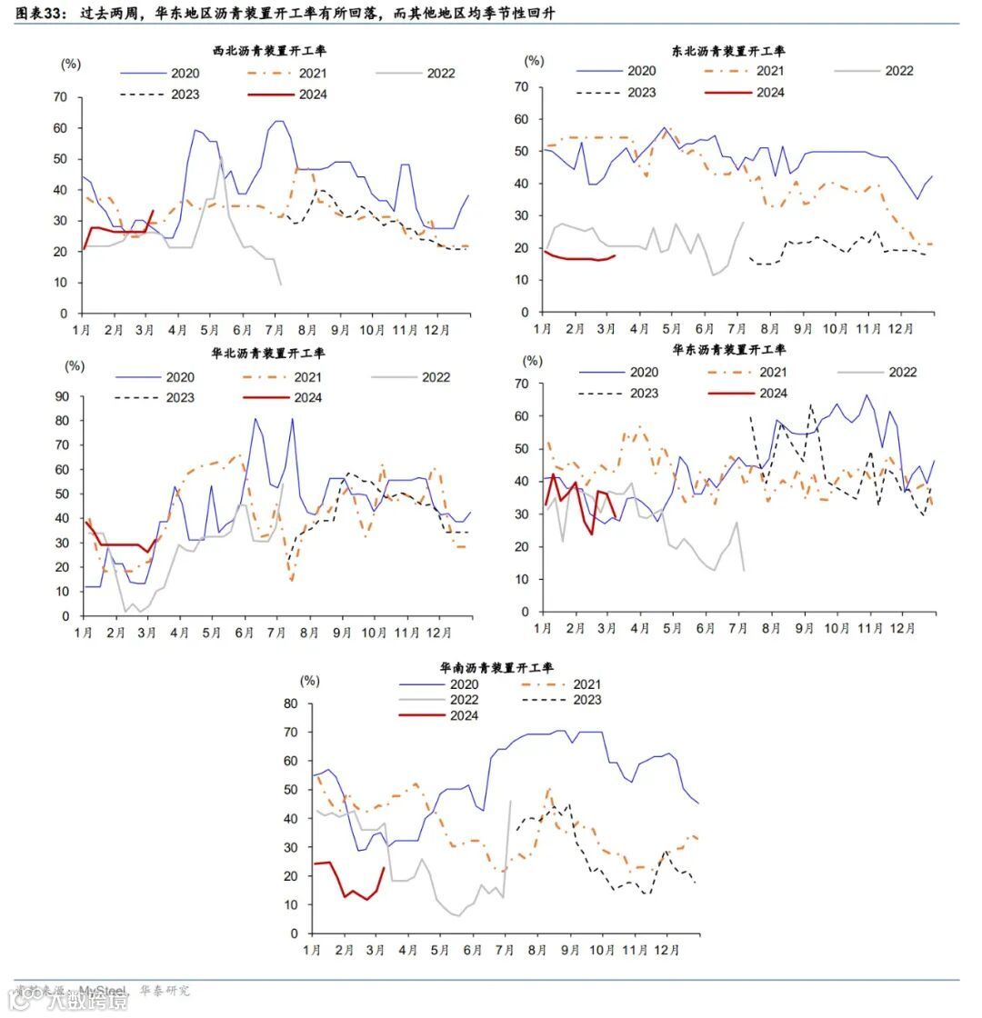 近两周,全国沥青装置开工率节后回升速度较往年偏慢。沥青是道路建设的主要用料,自2023年8-9月旺季后整体呈回落趋势。过去两周,全国沥青装置开工率环比上行3.7个百分点至26.9%,低于2021/2023年同期5.9/14.7个百分点(图表32)。分区域看,过去两周,仅华东地区沥青装置开工率有所回落,而其他地区沥青装置开工率均季节性上行,但大多低于往年同期水平(图表33)。