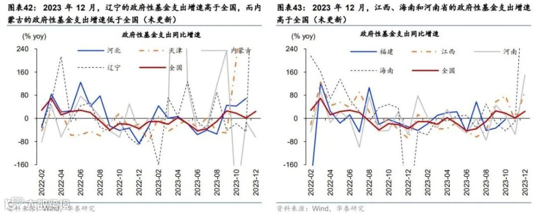 去年12月,已公布数据的重点化债省份加权平均政府性基金支出增长9.8%,不及全国平均24.2%的增速。去年12月政府性基金支出同比增速从11月的1.6%大幅回升至24.2%,而两年复合增速与11月的-10.5%基本持平。12月,已公布数据的重点化债省份天津、内蒙古、辽宁三省加权平均政府性基金支出增长9.8%,明显不及全国。其中,低基数下辽宁政府性基金支出同比增速高于全国,而天津和内蒙古的政府性基金支出同比增速低于全国(图表42-43)。