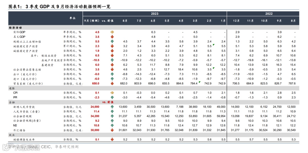 整体而言,高基数下、预计3季度实际GDP同比回落至4.5%左右,9月经济活动中工业生产边际回升、暑期出游等对服务消费的提振边际退坡,地方债同比多增对新增社融形成支撑、地产基本面下行趋势边际改善。